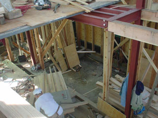 天井の梁の感じ。 これがライトアップされて 家らしくなってきた! |