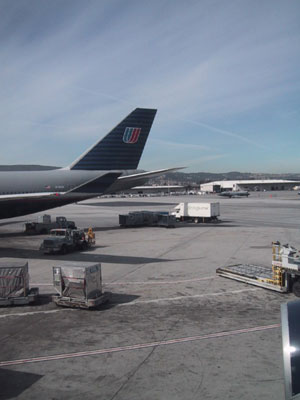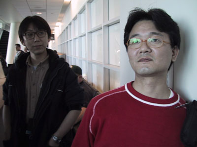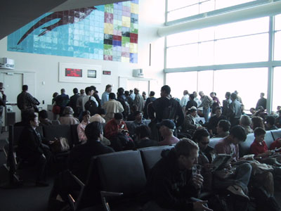日本へ向かう飛行機を待つ、たくさんのひとびと。 ちょっと疲れ気味のタカツキさんとオオトモさん。